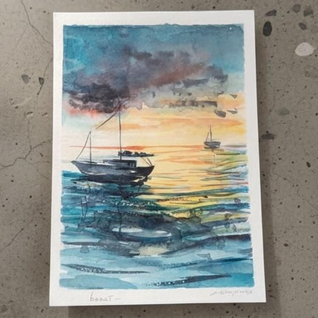 L'aquarelle Sunset boat est une oeuvre originale de format A5cm, realisee sur papier aquarelle 300g/m3.