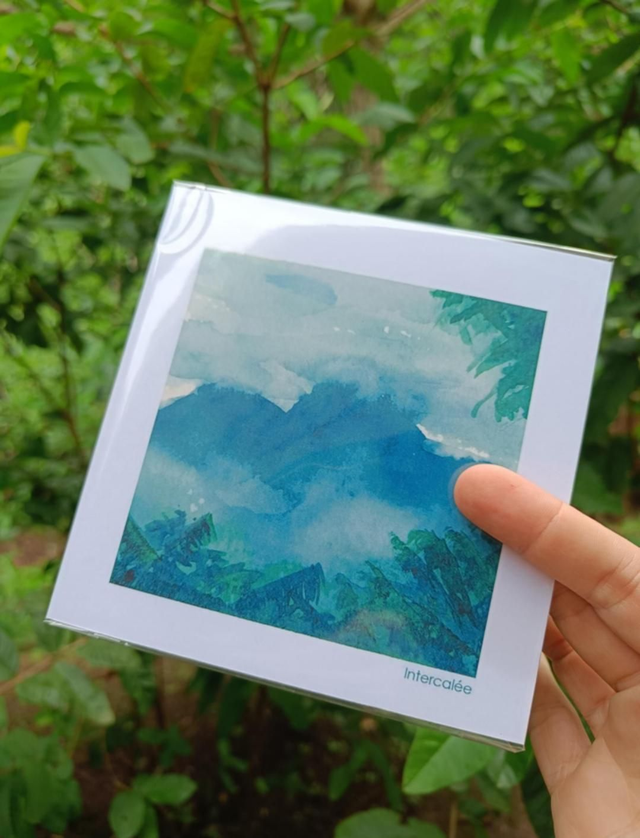 Les Pitons du Carbet dans la brume - reproduction de l'aquarelle originale inspirée des paysages emblématiques de Martinique, au format carré 13x13 cm sur papier couché 300 g/m2.