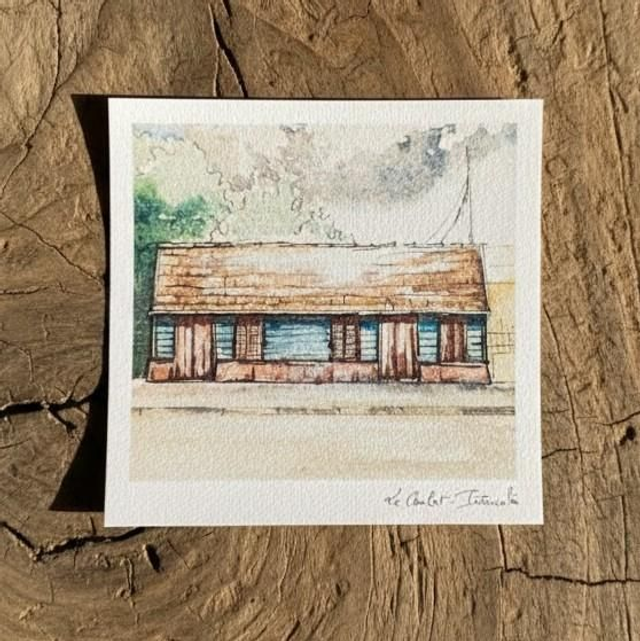 Cette ti kaz koulè est une carte postale format 15x15 cm, réalisée d'après un dessin original de case créole du Carbet (Martinique), réalisé à l'encre et à l'aquarelle sur papier 300gr.
