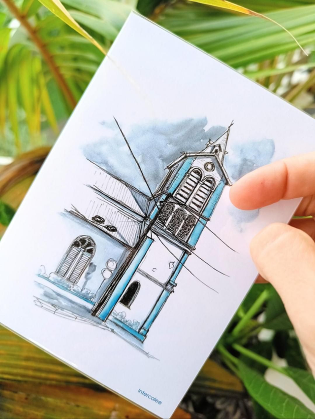 La reproduction du dessin à l'encre et à l'aquarelle de l'église du Robert (Martinique) est proposée au format A6 (10.5 x 14.8 cm) sur papier couché 300 g/m2.
