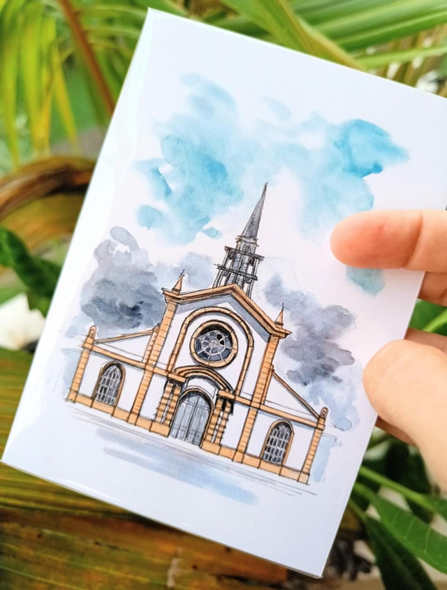 La reproduction du dessin à l'encre et à l'aquarelle de l'église du François (Martinique) est proposée au format A6 (10.5 x 14.8 cm) sur papier couché 300 g/m2.
