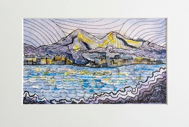 La baie de Fort de France (ou baie des Flamands), est un dessin stylisé à l'encre et à l'aquarelle de l'un des paysages les plus emblématiques de Martinique.