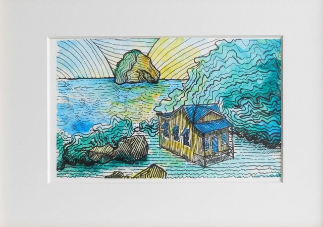 La maison du bagnard et le Rocher du Diamant est un dessin stylisé à l'encre et à l'aquarelle de l'un des paysages les plus emblématiques de Martinique.