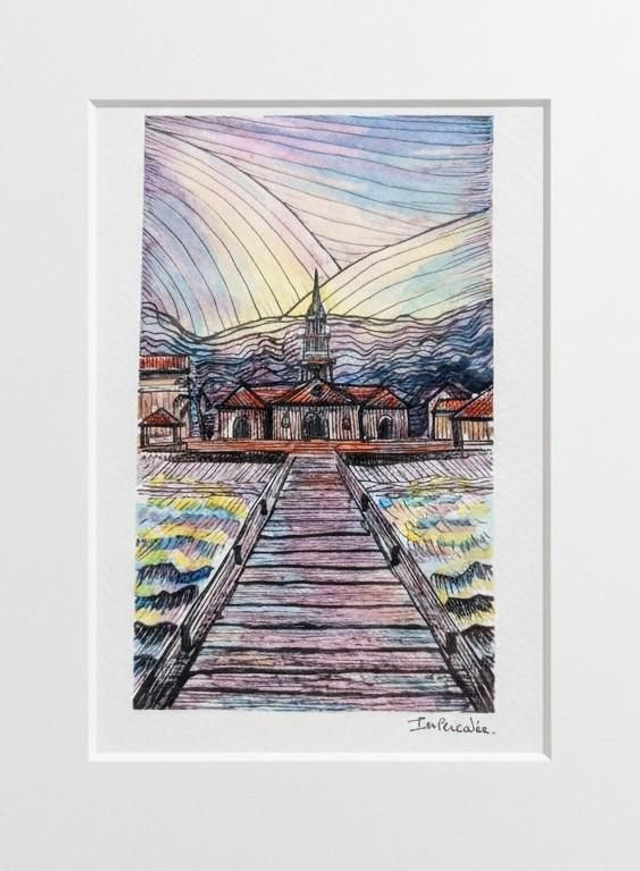 Le Ponton et l'église du bourg des Anses d'Arlet (Martinique), un dessin stylisé à l'encre et aquarelle de la série Lines.