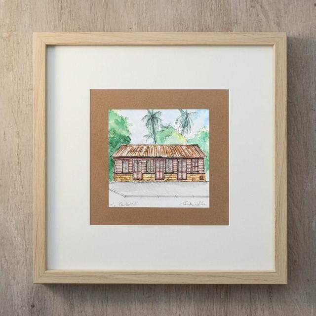 Mini kaz Koulè #1 est une oeuvre originale de la série Ti kaz koulè. Ce dessin de case créole du Carbet, en Martinique, est réalisé à l'encre et à l'aquarelle sur papier grain fin 250 g/m2, de format 10x10 cm.