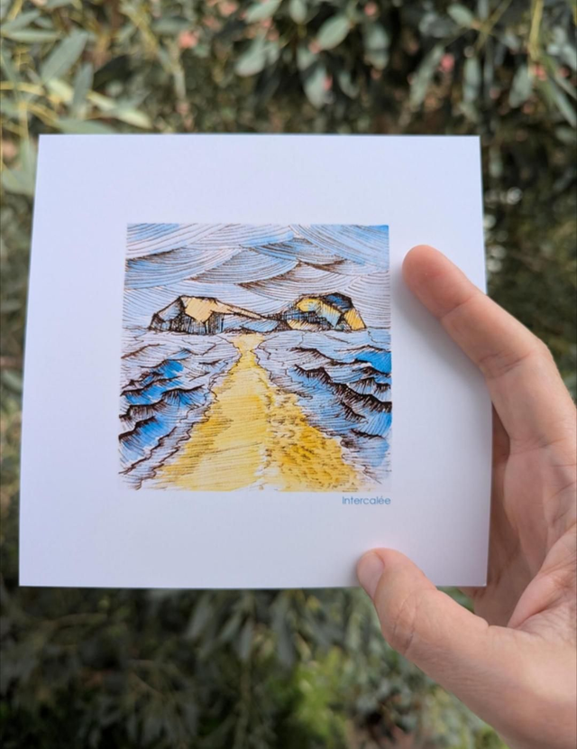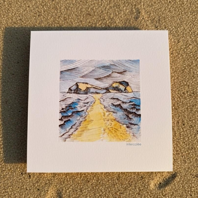 La reproduction du dessin stylisé à l'encre et à l'aquarelle le Tombolo de Sainte-Marie (Martinique) est proposée au format carré :