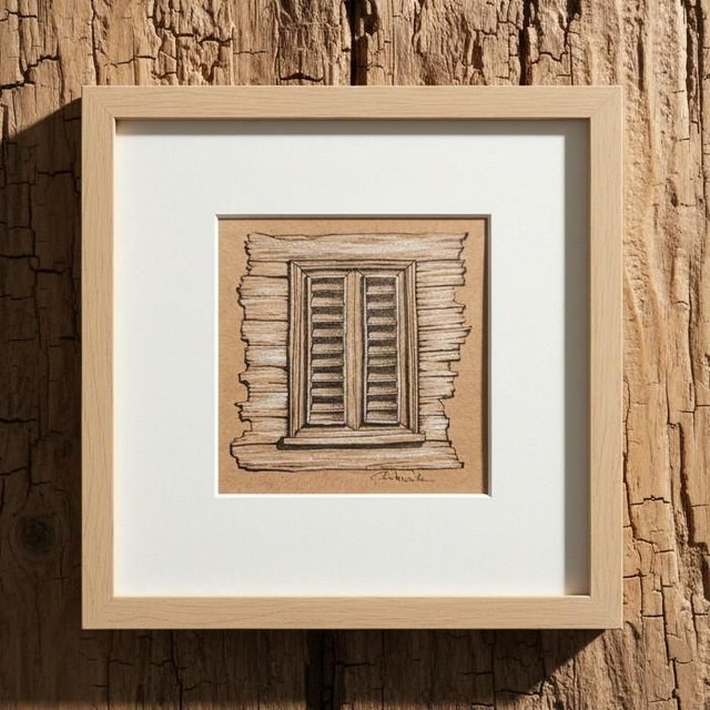 Jalousie #1 est un dessin des fenêtres traditionnelles des cases créoles de Martinique, faites de lamelles de bois ajourées pour ventiler l'intérieur. Cette oeuvre originale est réalisée à l'encre rehaussée au crayon blanc sur papier Kraft 220g/m2 au format 13,5x13,5cm. Cadre bois 20x20cm inclus.