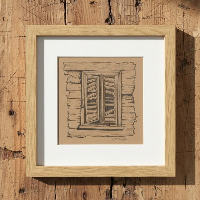Jalousie #4 est un dessin des fenêtres traditionnelles des cases créoles de Martinique, faites de lamelles de bois ajourées pour ventiler l'intérieur. Cette oeuvre originale est réalisée à l'encre sur papier Kraft 220g/m2 au format 13,5x13,5cm. Cadre bois 20x20cm inclus.