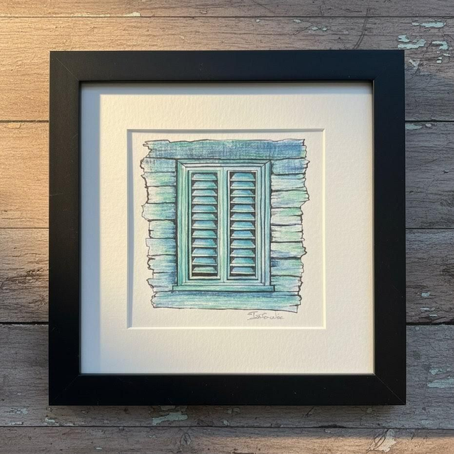 Jalousie #8 est un dessin des fenêtres traditionnelles des cases créoles de Martinique, faites de lamelles de bois ajourées pour ventiler l'intérieur. Cette oeuvre originale en camaïeu de bleu est réalisée à l'encre rehaussée au crayon de couleur sur papier en fibre de bambou 250g/m2 au format 13,5x13,5cm. Cadre bois 20x20cm inclus.