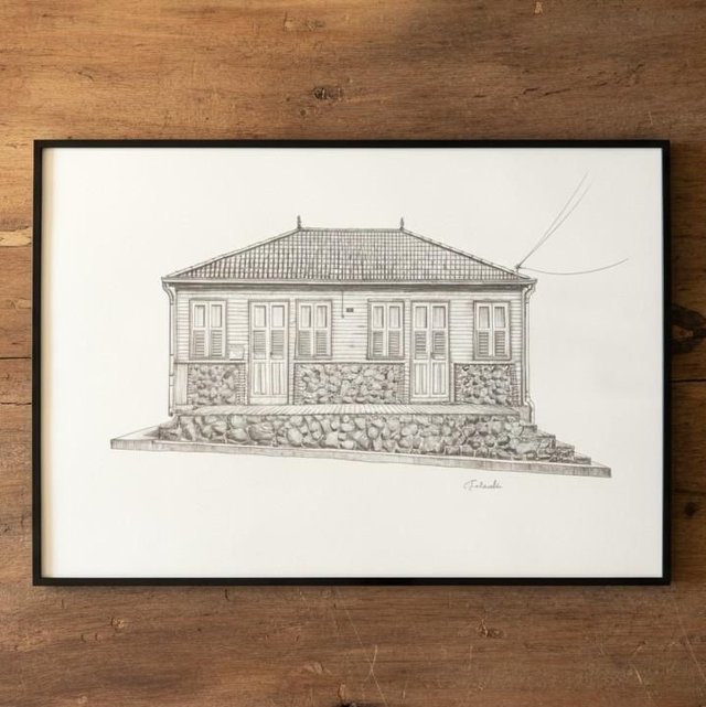 Kaz Kreyol #16 - Les Trois Ilets est une oeuvre originale monochrome de format 50x70 cm sur papier grain fin. Ce dessin de case créole traditionnelle de Martinique est réalisé à l'encre et au crayon graphite.