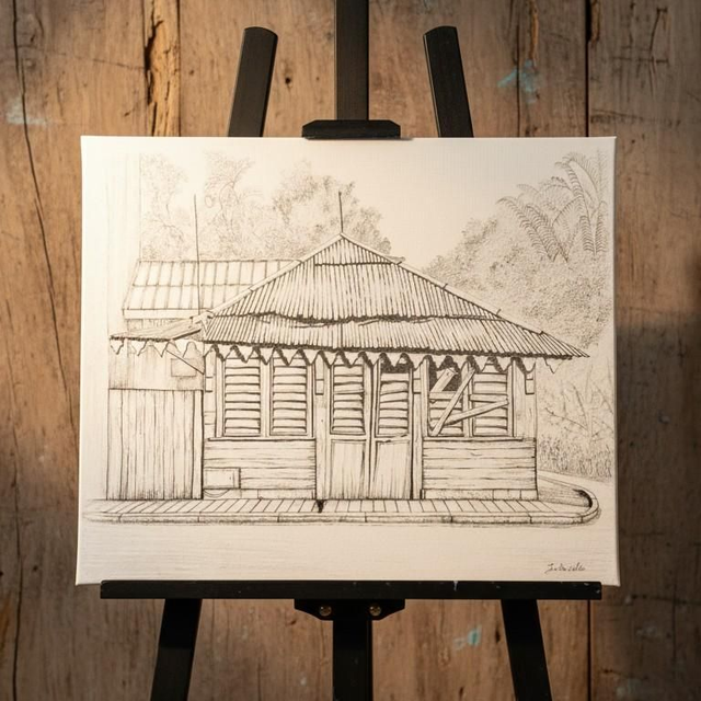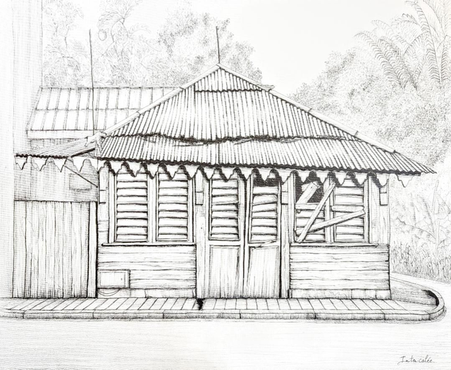 Case créole du St Esprit, Martinique, réalisée sur toile coton 60x60cm a l'encre et la mine graphite.