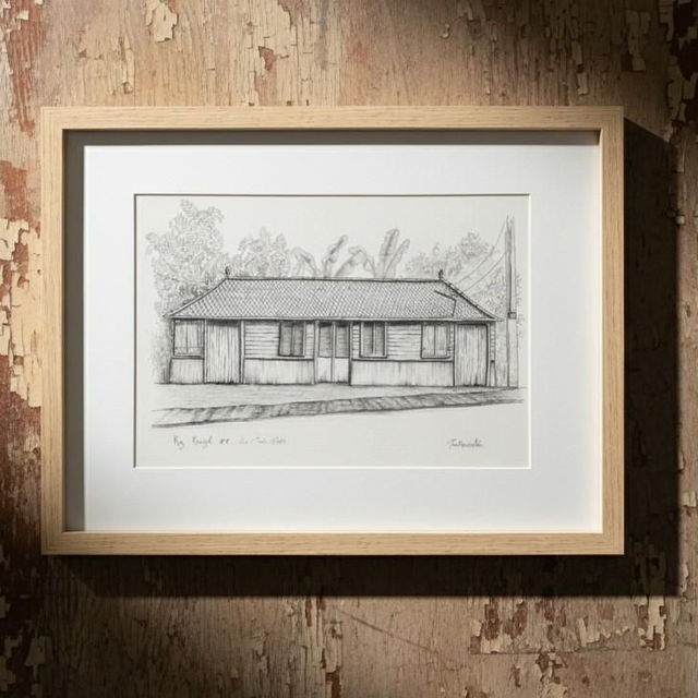 Le dessin à l'encre et au crayon graphite Kaz Kreyol #7 - Les Trois Ilets est une oeuvre originale monochrome format A4 (21x29,7 cm) réalisée sur papier grain fin 120g/m2.