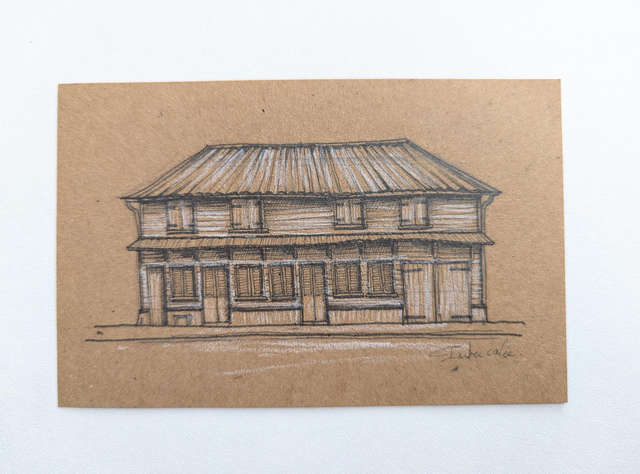 Kaz Kraft #3 est un dessin de case créole de la ville du Saint Esprit en Martinique. Cette oeuvre originale est réalisée à l'encre sur papier Kraft 110g/m2 au format 8,2x12,8 cm. Cadre A5 (14,8x29,7 cm) inclus.