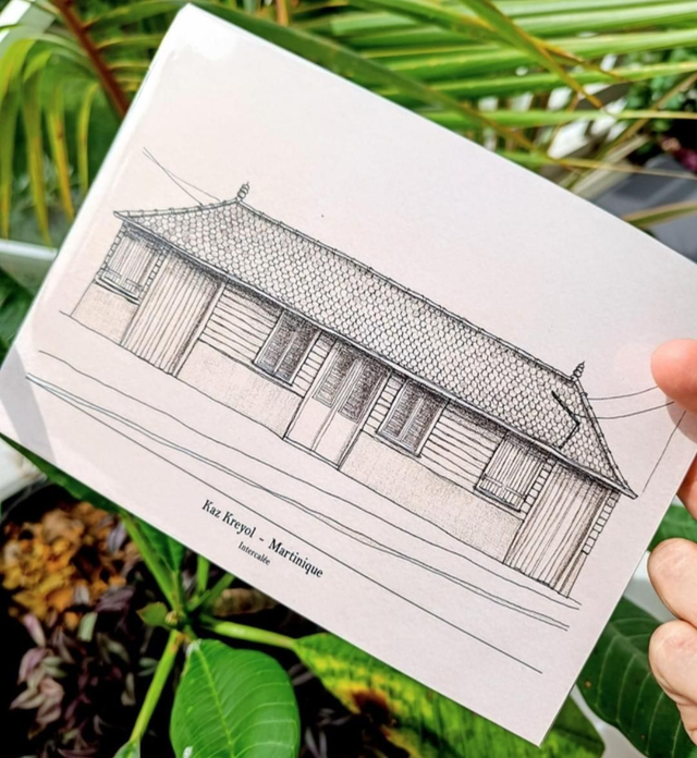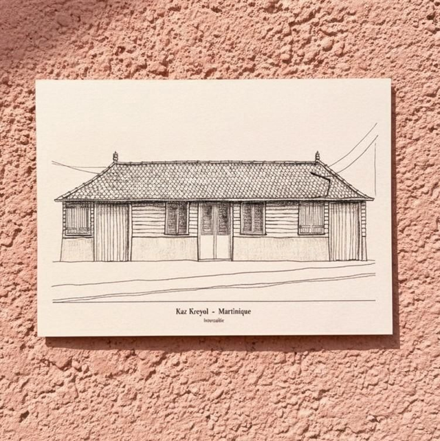 La reproduction du dessin à l'encre et au crayon graphite Kaz Kreyol #7 des Trois Ilets (Martinique) est proposée au format 14.8x19 cm (A5) sur papier couché 300 g/m2, fond teinte chaude beige rosé.