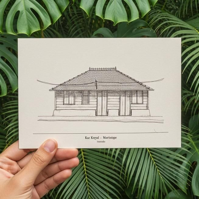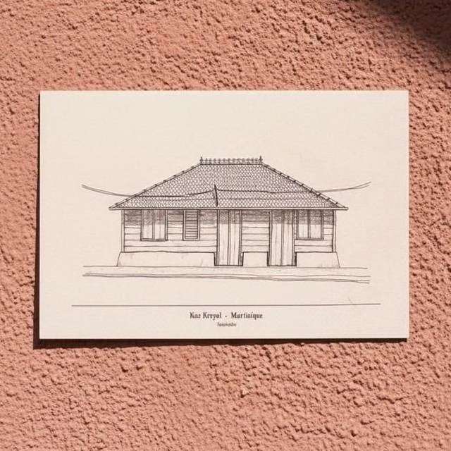 La reproduction du dessin à l'encre et au crayon graphite Kaz Kreyol #8 des Trois Ilets (Martinique) est proposée au format 14.8x19 cm (A5) sur papier couché 300 g/m2, fond teinte chaude beige rosé.
