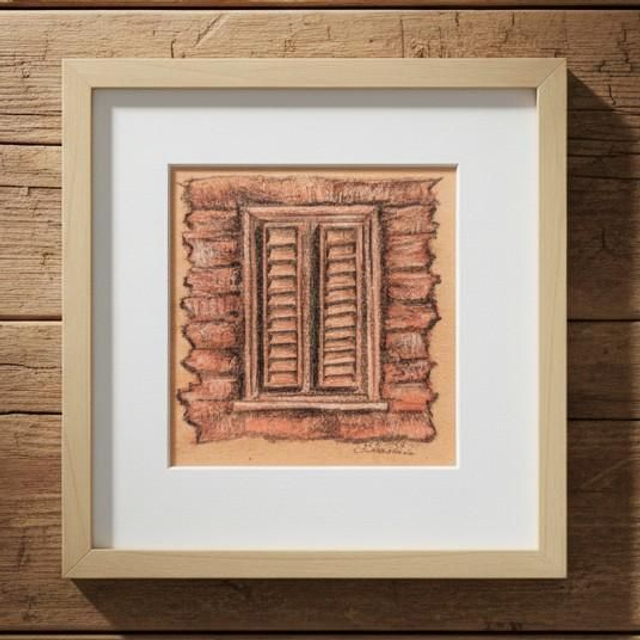 Jalousie #5 est un dessin des fenêtres traditionnelles des cases créoles de Martinique, faites de lamelles de bois ajourées pour ventiler l'intérieur. Cette oeuvre originale est réalisée au pastel sec sur papier Kraft 220g/m2 au format 13,5x13,5cm. Cadre bois 20x20cm inclus.