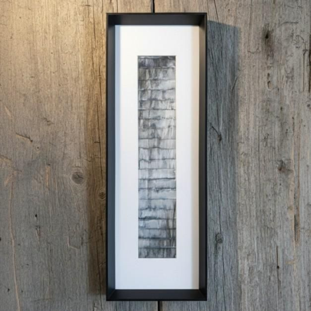 Cette œuvre s'intéresse à la texture patinée des bardages bois, à la fois douce et rugueuse, comme l'évoquent la superposition des différentes techniques mises en œuvre : aquarelle, pastel sec et collage.